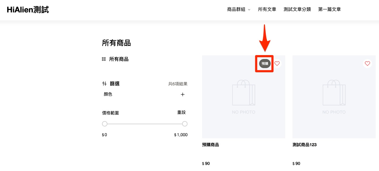 2.當開啟預購功能,前台頁面會顯示「預購」標籤提示。