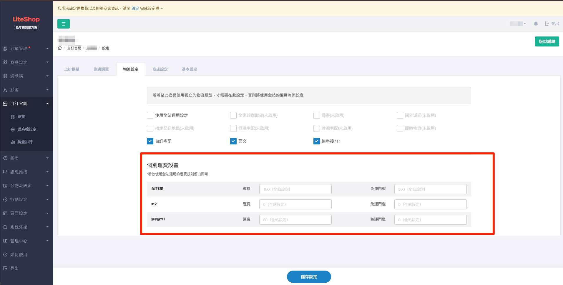 路徑:金物流設定>物流/運費