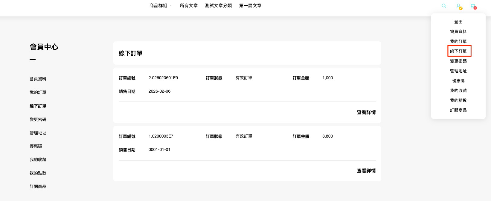顧客登入後可於前台會員中心點按「線下訂單」查看訂單