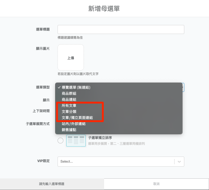 選單類型可選擇「所有文章」、「文章分類」、「文章/獨立頁面連結」