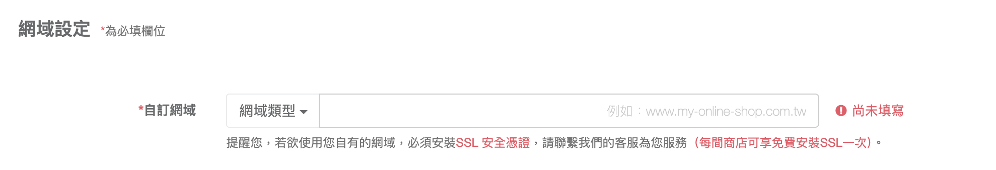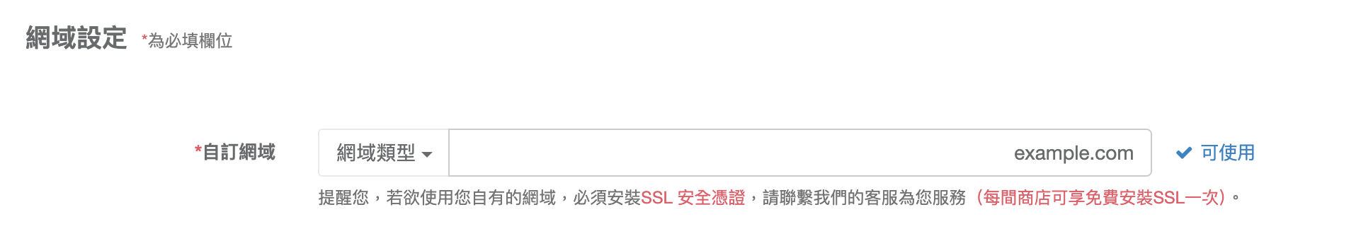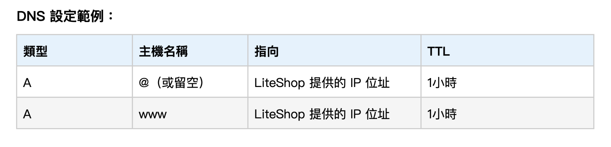 *若選擇使用自有網域,會需要在網域管理平台後台設定 DNS ,DNS 需要與線上客服索取,且網址需要安裝 SSL ,目前每間商店 LiteShop 會免費贈送一次。