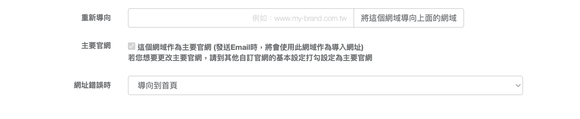 在舊的平台的自有網域是: 123.com.tw ,後續使用 LiteShop 之後購買了新的獨有網域:shopbuy.com.tw,這時如果希望顧客點擊 123.com.tw 可以跳轉到 shopbuy.com.tw ,就可以在此欄位填上 123.com.tw