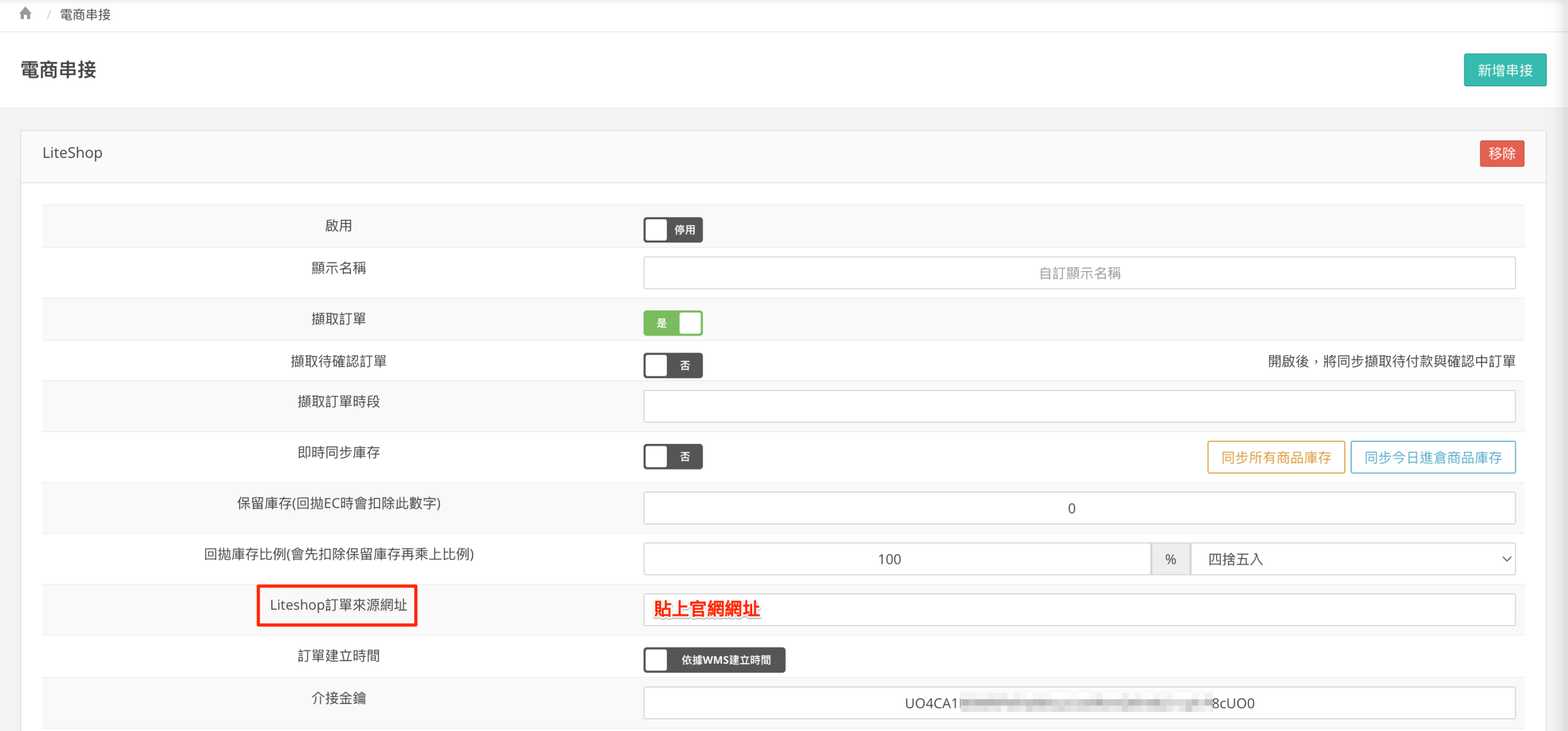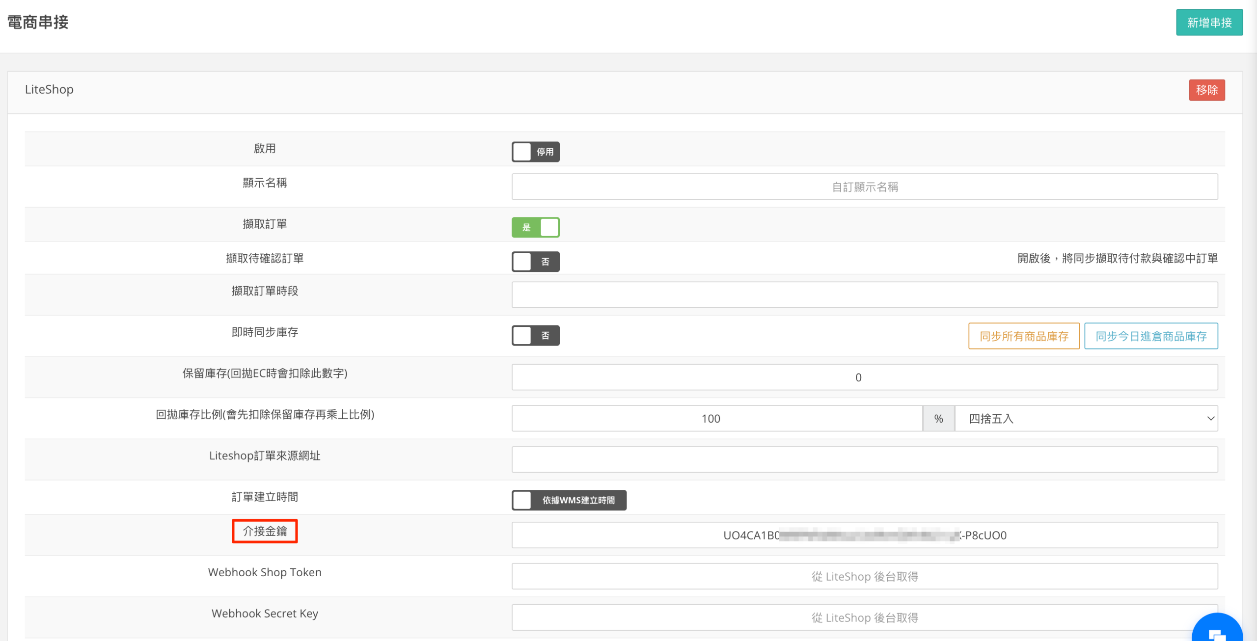 9、介接金鑰:LiteShop 與 WMS 串接的金鑰