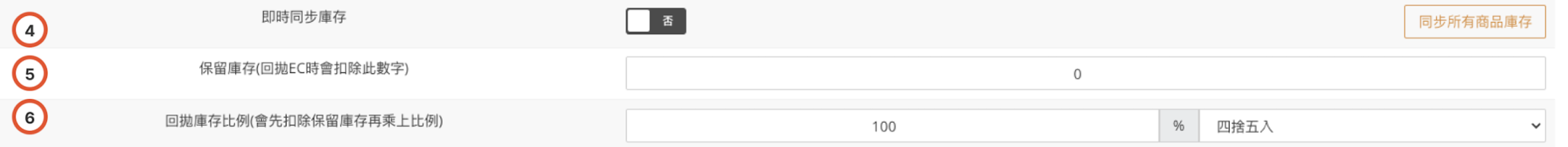 6、回拋庫存比例:設定回拋庫存比例,系統會先將位於 WMS 的指定倉別「商品庫存量」-「保留庫存」*「回拋庫存比例」=實際同步庫存至 LiteShop 後台的數量