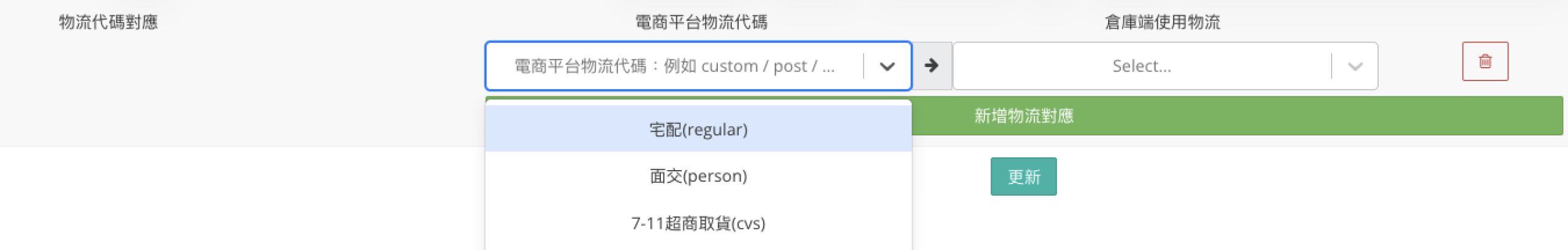 - (1.)在 物流代碼對應欄位 點擊「新增物流對應」後,點擊「電商平台物流代碼」下拉選單會列出平台支援設定的物流方式。