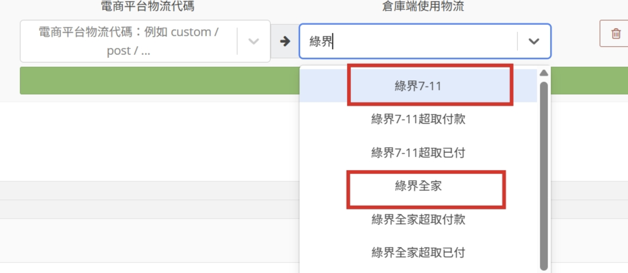 - • 7-11 以及全家,若配合的倉庫是使用綠界客代,物流對應請選擇「綠界 7-11 以及綠界全家」,系統會自動判斷是否要代收款項