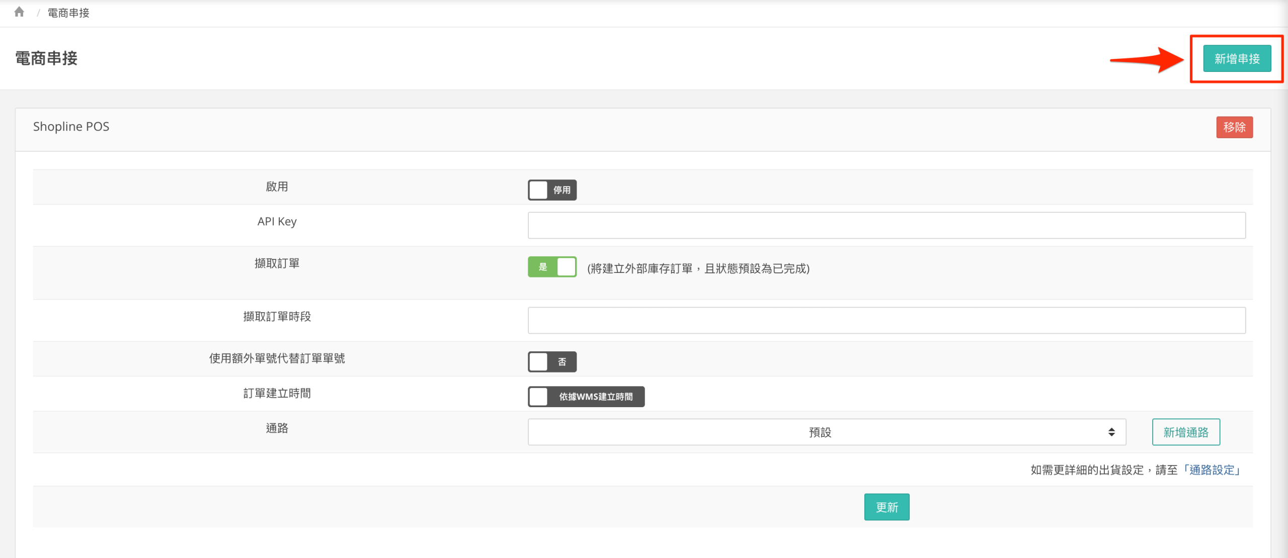至 WMS 後台「廠商設定>電商串接 」點擊右上角「新增串接」