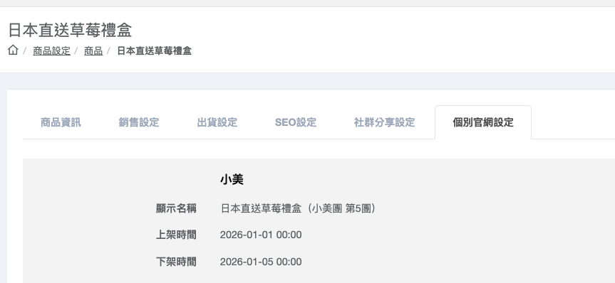 當商店有多個官網時,同一個商品可以針對各官網設定不同的「顯示名稱」和「上下架時間」。沒有設定的官網會自動沿用商品本身的設定。